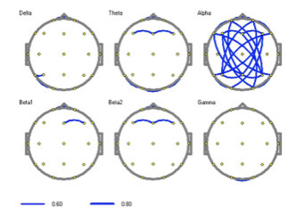 - Very high coherence in the alpha range, especially from 10.5 to 11 Hz, very good symmetry (almost no asymmetry) and very good synchrony, i.e. above-average coordination between the left and right hemispheres of the brain and between the rear (subconscious) and center + front (consciousness).